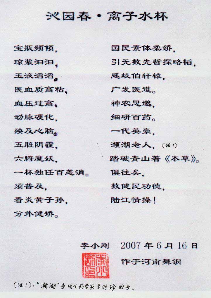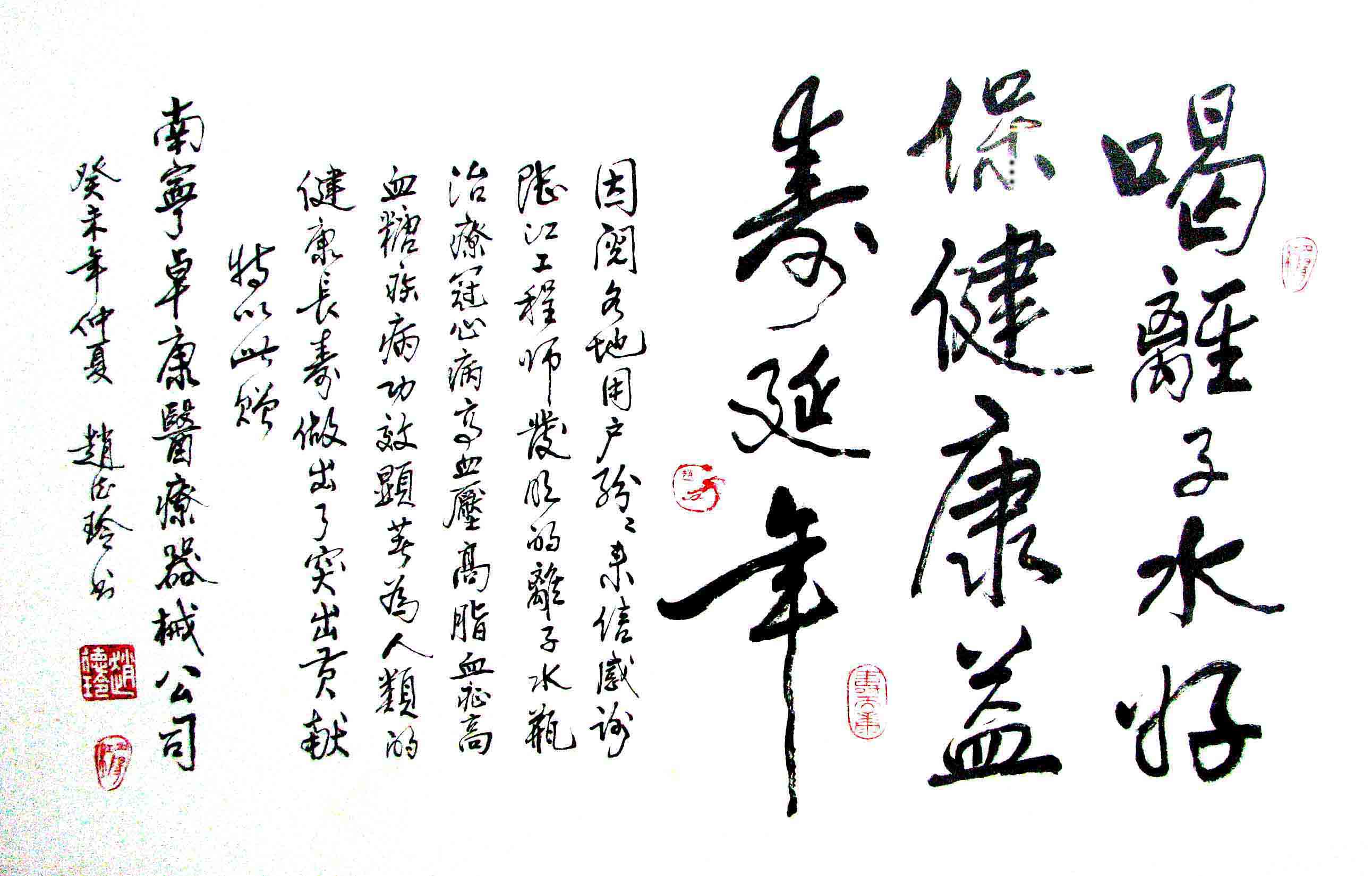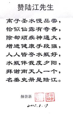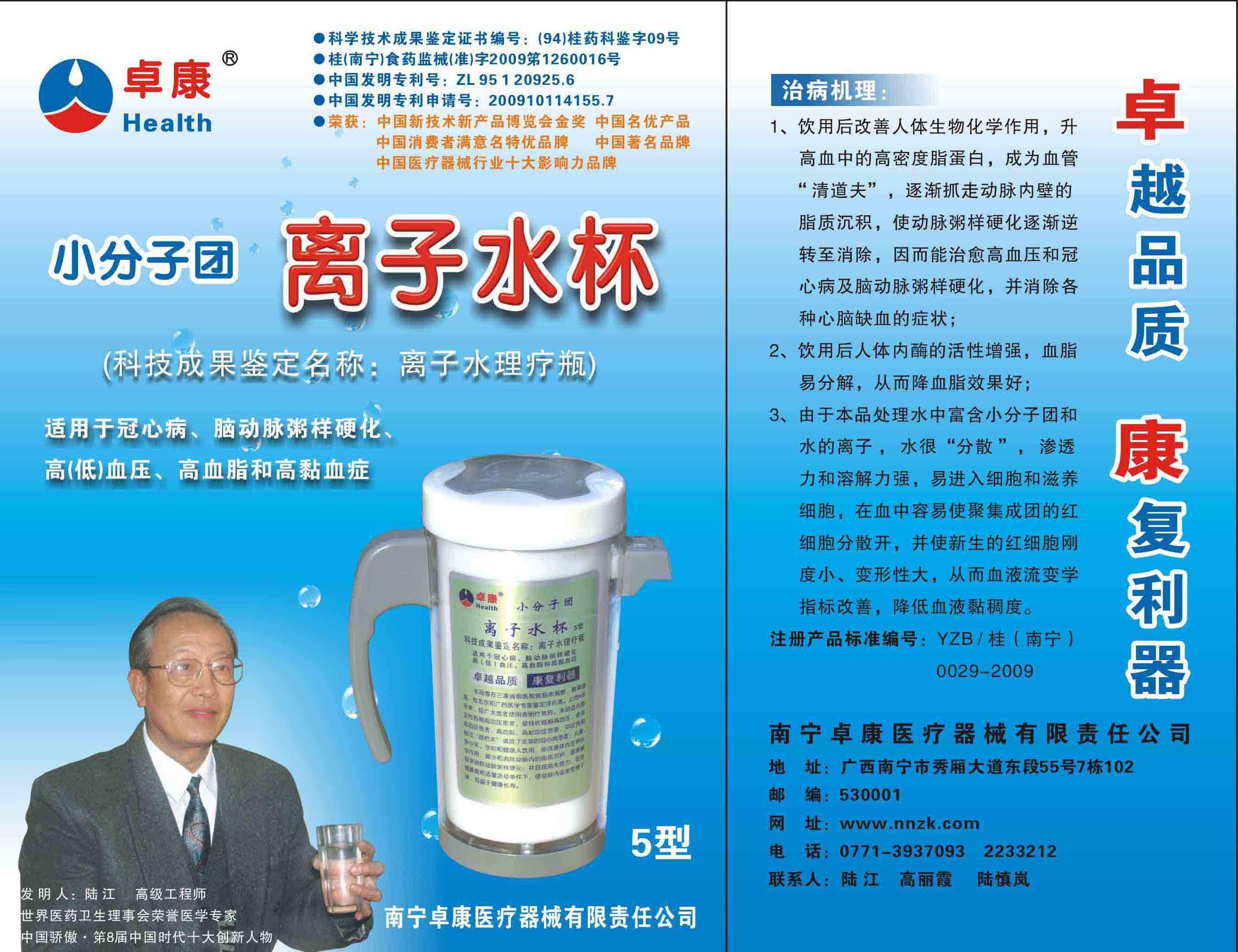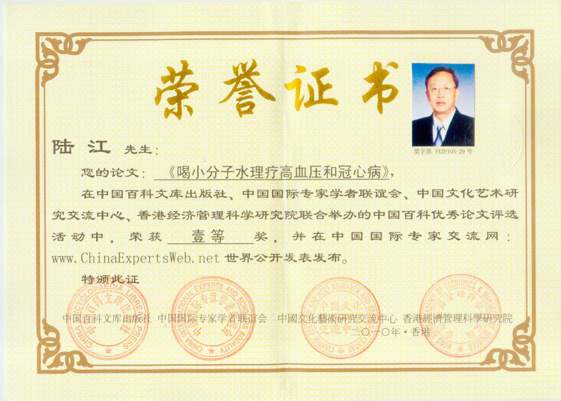 -----我是從事建筑的高工,本來沒有資格去攻克醫(yī)學(xué)難題,卻為了自身健康才扣響醫(yī)學(xué)的大門。由于我1990年患高血壓,因怕中風(fēng)才研究發(fā)明了離子水瓶,我把水處理成微小分子團(tuán)水,飲用后治愈了高血壓。便于1993年底送到三家省級(jí)醫(yī)院做臨床試用4個(gè)月。經(jīng)北京和廣西醫(yī)學(xué)專家鑒定:"降脂降壓效果好"," 能擴(kuò)大心腦動(dòng)脈流量,改善心腦電圖以及微循環(huán)","對(duì)治療心腦動(dòng)脈粥樣硬化、高血壓、高血脂有良好的醫(yī)療保健作用。""產(chǎn)品的技術(shù)性能和療效達(dá)到了同類產(chǎn)品的國內(nèi)領(lǐng)先水平,經(jīng)廣西醫(yī)學(xué)科學(xué)情報(bào)研究所檢索,未見國外有類似報(bào)道。"中國醫(yī)學(xué)科學(xué)院張正國教授從美國國立醫(yī)學(xué)圖書館數(shù)據(jù)庫存Medline檢索英俄文資料,均未見類似報(bào)告。2000年上市后,我為了對(duì)消費(fèi)者負(fù)責(zé)而繼續(xù)觀察研究,一直通過《信譽(yù)卡》和《質(zhì)量跟蹤調(diào)查書》向患者承諾療效,請用戶使用6個(gè)月后反饋效果。和脂壓患者飲用2至5個(gè)月內(nèi),消除癥狀,停服藥物,血壓正常;冠心病患者飲用3~5個(gè)月逐漸減輕至消除心絞痛、房顫等癥狀,不再服藥,飲用1年左右心電圖正常,經(jīng)冠脈造影掃描無明顯狹窄,表明冠心病痊愈。大量患者還反映許多衰弱器官被修復(fù),讓前列腺增生、慢性咽喉炎、慢性氣管炎、支氣管炎、慢性胃炎、腸炎和膽囊炎等不藥而愈;2型糖尿病患者是因?yàn)橐葝u衰弱致病,飲用該水半年至一年,逐漸減藥至停藥,血糖尿糖正常,真正治愈2型糖尿病。中風(fēng)后遺癥患者飲用六七個(gè)月,可逐漸減輕至消除肢體和語言障礙,表明飲用該水能讓壽命很長的神經(jīng)元細(xì)胞逐漸修復(fù),奇跡般地恢復(fù)肢體和語言功能。飲用后還使胸腺和脾臟兩個(gè)重要的免疫器官被修復(fù)和增強(qiáng),產(chǎn)生免疫細(xì)胞多,提高了免疫力,使人不生病或少生病。自此, 飲用微小分子團(tuán)水創(chuàng)造了攻克冠心病、高(低)血壓和糖尿病三大醫(yī)學(xué)難題的奇跡。人們對(duì)此感到不可思議,但實(shí)踐是檢驗(yàn)真理的唯一標(biāo)準(zhǔn)。