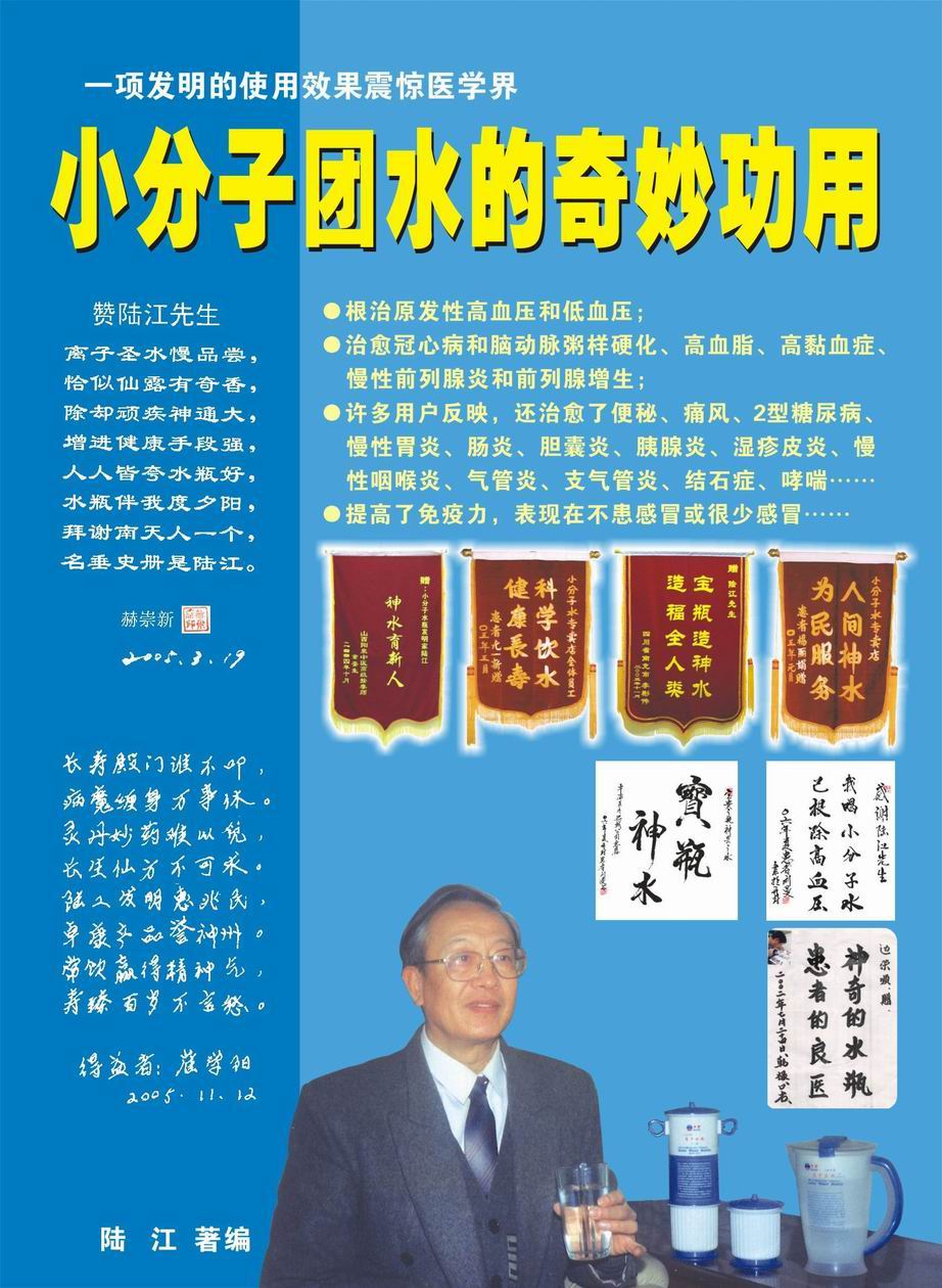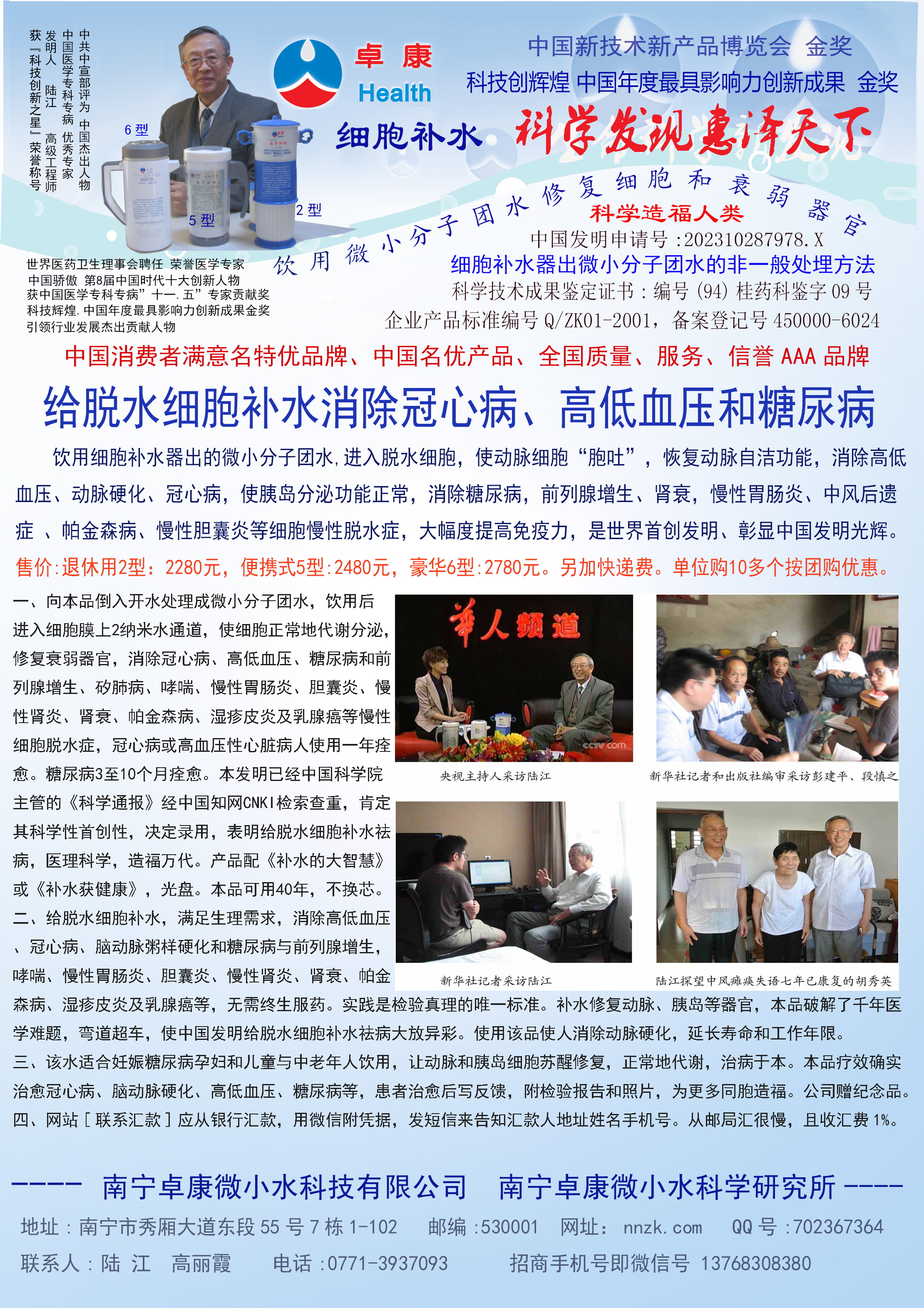人類幾千年來患以上病癥需終生服藥,幾十年也不能治愈。可是我國南寧的高級(jí)工程師陸 江,于1990年想根治高血壓,研究發(fā)明了離子水瓶,處理出微小分子團(tuán)水供飲用,經(jīng)過醫(yī)院臨床試用和專家鑒定,1999年獲中國發(fā)明專利權(quán),產(chǎn)品于2000年投放市場后一直跟蹤調(diào)查,據(jù)全國各地用戶反饋:祛除了高低血壓、糖尿病和冠心病,并使前列腺增生、咽喉炎、鼻竇炎、慢性氣管炎、支氣管炎、矽肺病、哮喘、慢性胃炎、腸炎、慢性膽囊炎、慢性腎炎、腎衰、膀胱炎、便秘、痔瘡、風(fēng)濕性關(guān)節(jié)炎和濕疹皮炎及中風(fēng)后遺癥等病癥不藥而愈。為什么喝微小水能治20多種病?陸 江從1991年德國科學(xué)家發(fā)現(xiàn)細(xì)胞膜水通道僅為2納米獲得啟發(fā),認(rèn)為多種器官患病是因細(xì)胞脫水,不能正常代謝和分裂增殖,才使器官細(xì)胞減少致衰弱萎縮而形成細(xì)胞缺水性病癥。22年來的實(shí)踐有力地支持了“細(xì)胞脫水致病”這一重要論點(diǎn),表明喝微小水可滿足細(xì)胞的生理需求,補(bǔ)水就能祛病,是生命科學(xué)新亮點(diǎn)。